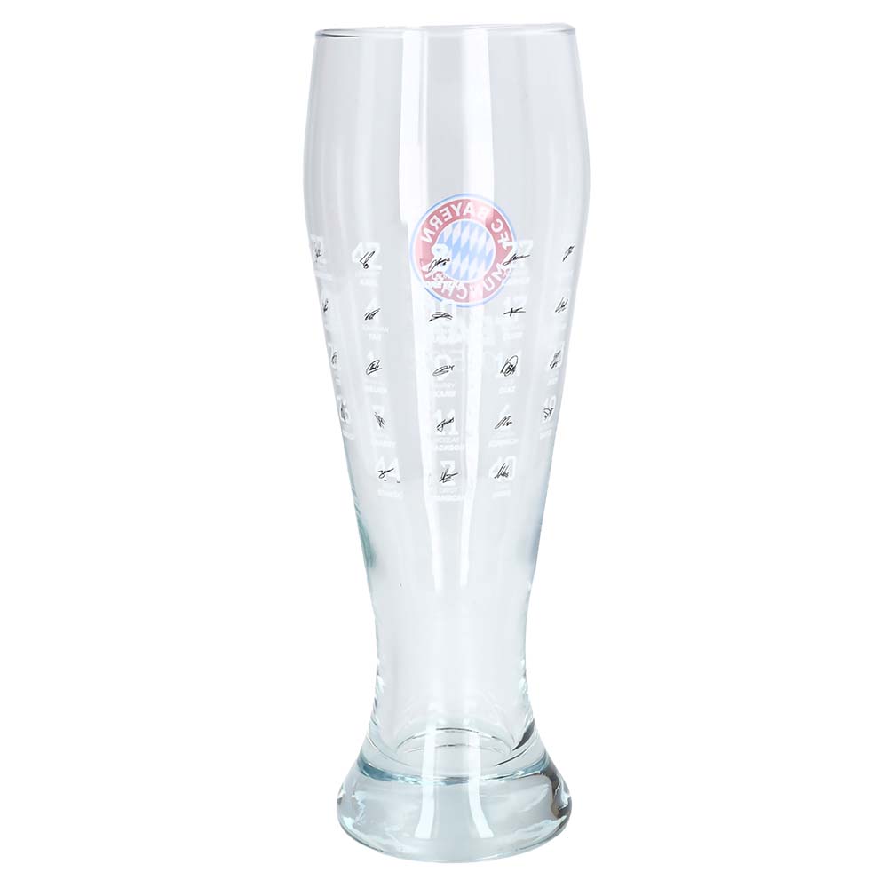 Auf den Sieg gebührend anstoßen mit dem FC Bayern München Weißbierglas Signature Team gedruckte Unterschriften. Die Signaturen der Spieler vom Team 2025/26 zieren dezent das Glas, während das FCB Logo und seinen Vereinsfarben sofort ins Auge fällt.