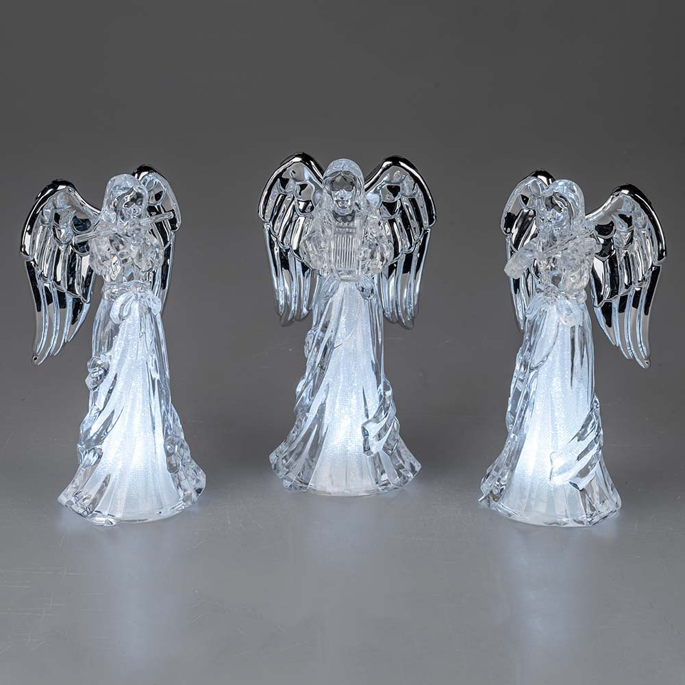 Ein Engel mit Geige, Harfe oder Querflöte in 17 cm mit silbernen Flügeln veredelt und LED-Licht aus Acryl und Timer. Eine faszinierende Weihnachtsdeko von formano.