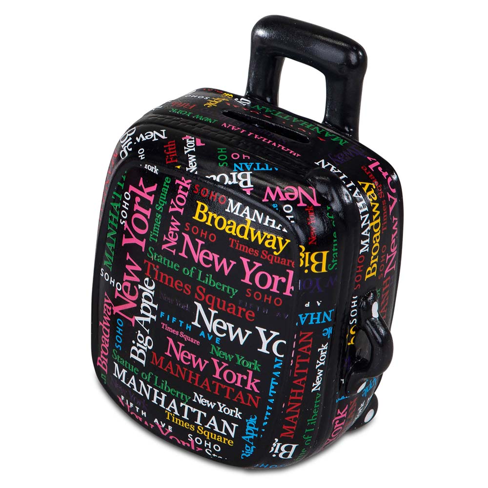 Eine Spardose mit Schloß 12 x 15 cm Koffer in pink, schwarz oder weiss aus Keramik mit glänzender Oberfläche von formano. Als Muster ein paar schöne Reiseziele Manhatten, Broadway, New York, Times Square, Statute of Liberty, SOHO, FIFTH AVE. Eine Spardose, Sparschwein oder Sparbüchse zum Sparen von Münzen durch einfaches Einbringen durch einen dafür vorgesehenen Einwurfschlitz. Das Entnehmen des Ersparten ist dagegen regelmäßig durch einen Verschluss / Schloss erschwert. Zum sparen für einen Herzens-Wunsch oder die nächste Reise / Urlaub.