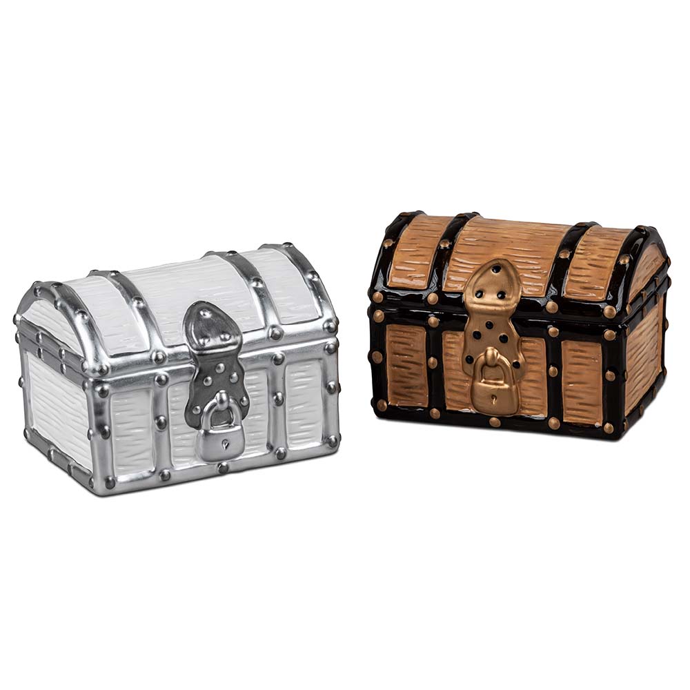 Eine Spardose als Schatztruhe 14 x 11 cm mit Schloss in weiß-silber oder braun-schwarz aus glasierter Keramik und handbemalt von formano. Eine Spardose, Sparschwein oder Sparbüchse ist ein Behältnis zum Sparen von Münzen durch einfaches Einbringen durch einen dafür vorgesehenen Einwurfschlitz. Das Entnehmen des Ersparten ist dagegen regelmäßig durch einen Verschluss / Schloss erschwert.
