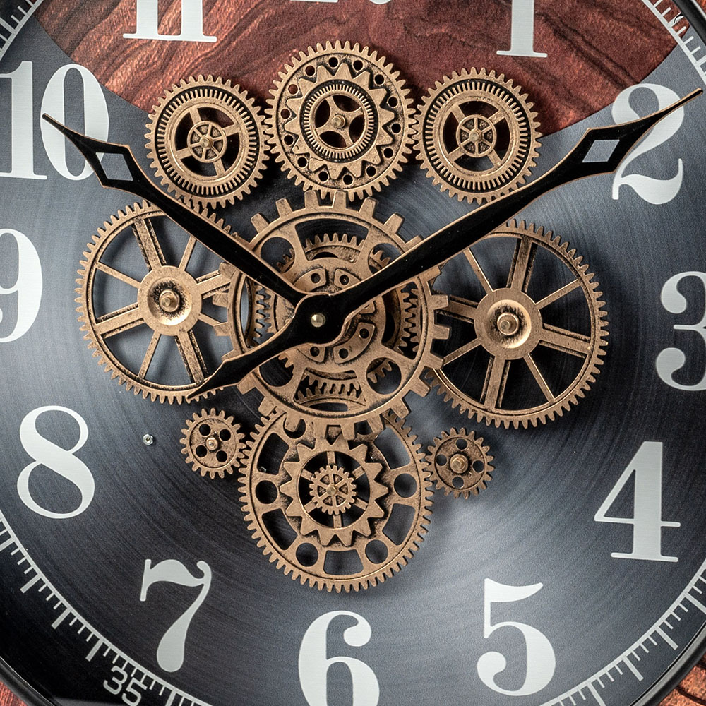 Wanduhr antik 59 x 7,5 x 59 cm aus Metall mit goldenen, sichtbar drehenden Zahnrädern und mit Wurzelholz-Dekor veredelt. Wenn es in dem Raum leise ist, ist der Zahnradmechanismus leise zu hören. Die Uhr ist mit 2 Batteriefächern ausgestattet, somit kann die Uhr mit den Zahnrädern oder auch geräuschlos alleine betrieben werden.