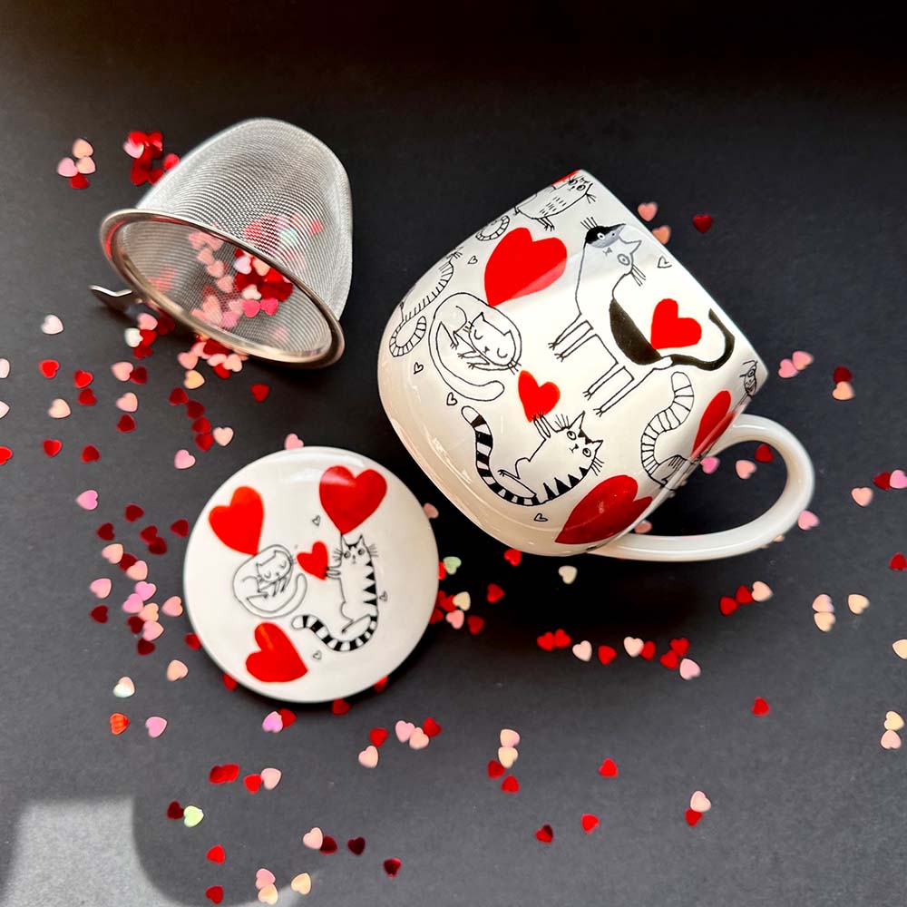 Der Becher Barrel 3tlg. Cat's World - Herzen 430ml in creme-weiss, mit zartem Glanz aus New Bone China Porzellan von DUO Sp. z o.o. ist eine schöne Teetasse mit Sieb und Deckel aus der Tier-Serie Animals. Die Katzen Tasse ist perfekt für die Zubereitung Ihrer Lieblingskräuter und aromatischen Tees. Der Teebecher für den Katzenliebhaber und dem Sammler.