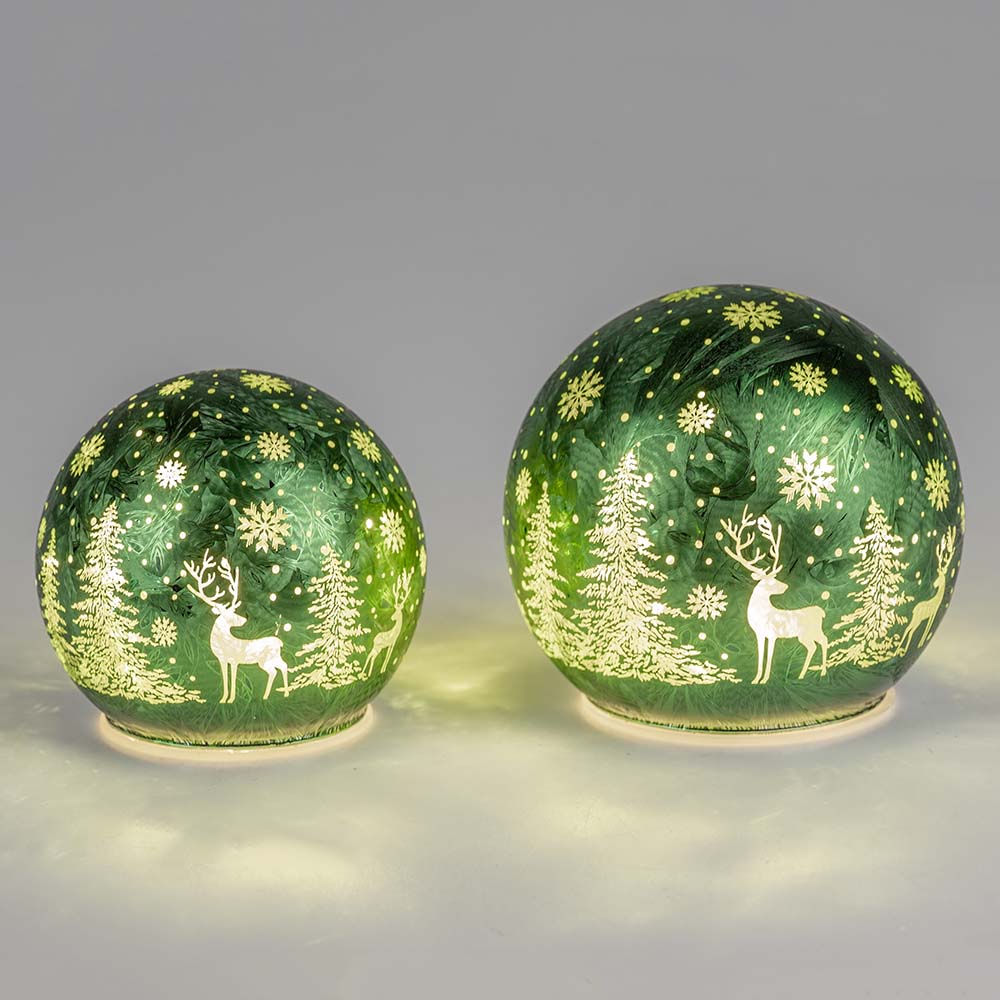 Deko-Kugel Frosty-Grün mit LED-Licht in 10 cm, 12 cm oder 15 cm aus Farbglas in geeister Optik mit winterlichem Dekor (Hirsche, Tannenbäume, Sterne) verziert; für 3x Batterien (nicht im Lieferumfang enthalten) inklusive Timerfunktion. Eine romantische Dekoidee für Ihre Advents- und Weihnachtsdeko aus dem Hause formano. Auf Bild 5 sehen Sie ein Anwendungsbeispiel für Ihre Dekorationsmöglichkeiten.