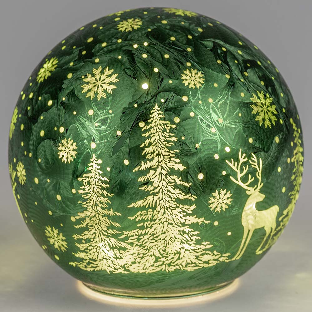Deko-Kugel Frosty-Grün mit Tannenbäumen LED-Licht aus Farbglas von formano
