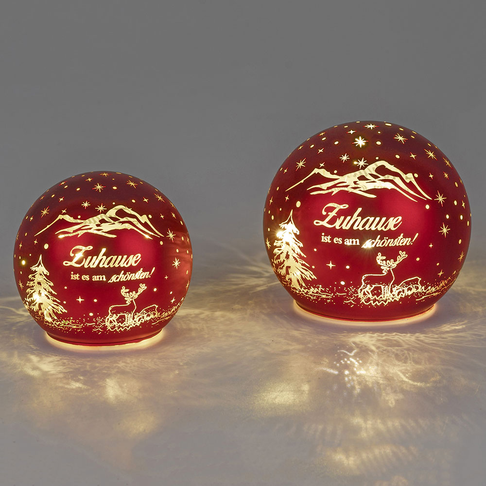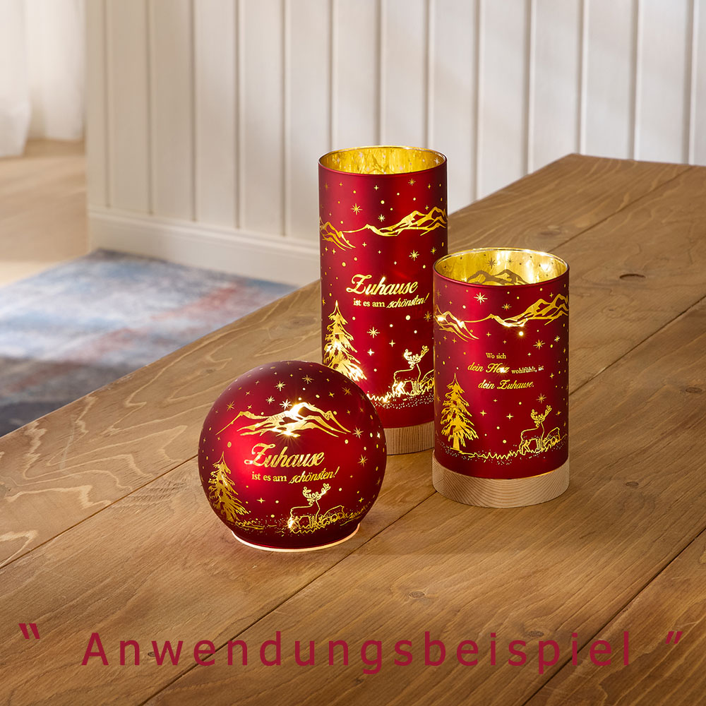 Deko-Kugel rot mit LED-Licht in 10, 12 oder 15 cm aus mattem Farbglas mit Spruch ( Zuhause ist es am schönsten! ) + Dekor wie Reh, Hirsch, Sterne und Tannenbaum verziert, goldener Innenfarbe; inklusive Timerfunktion. Die Dekolichter sind eine romantische Dekoidee für Ihre Advents- und Weihnachtsdeko aus dem Hause formano.