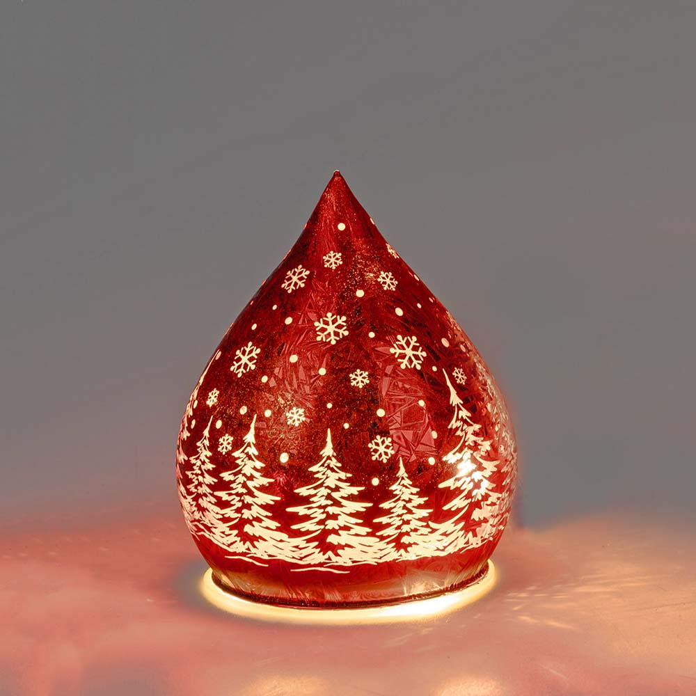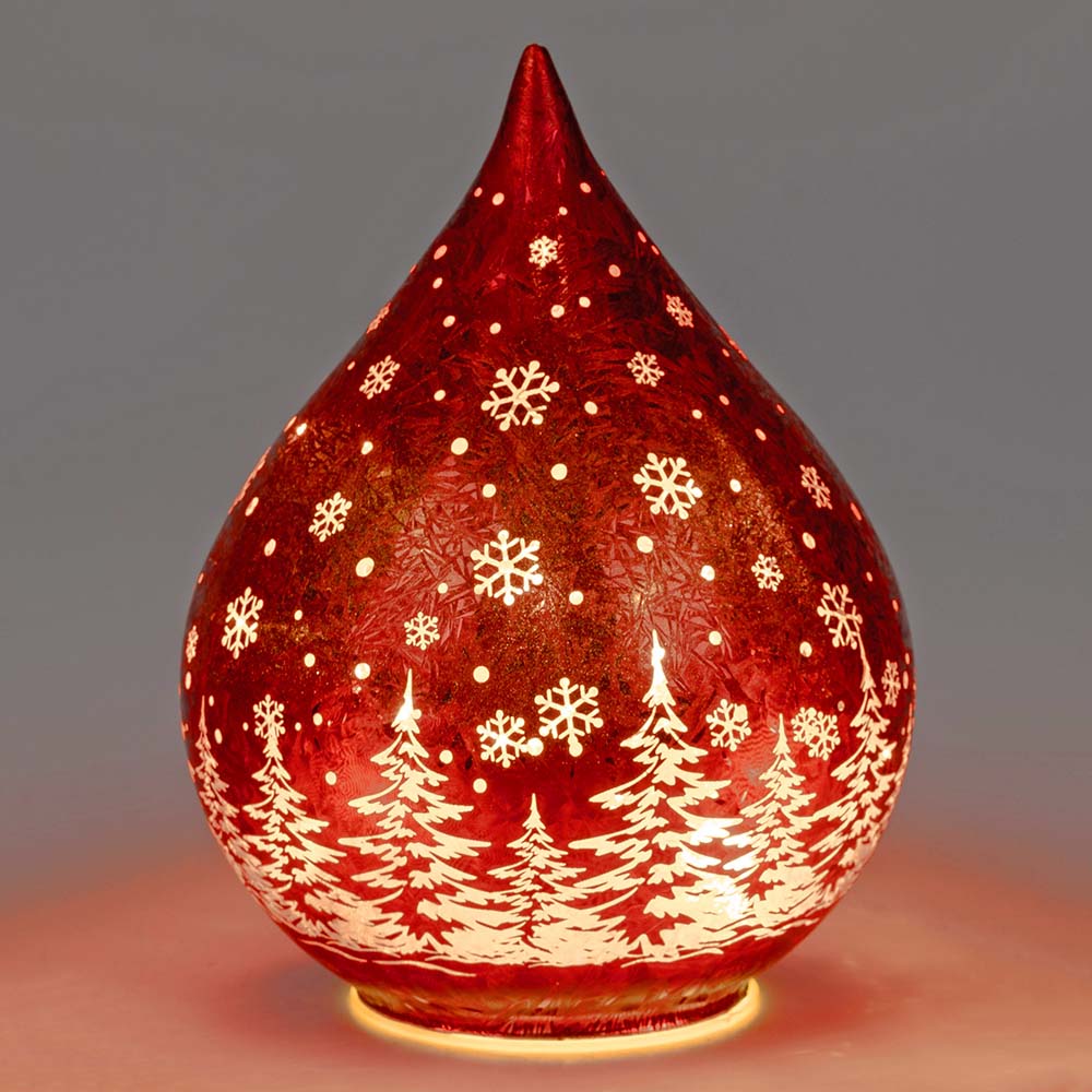 Deko-Tropfen Frosty Rot mit LED-Licht in 12 cm, 15 cm oder 20 cm aus mattem Farbglas in geeister Optik mit winterlichem Dekor ( Sterne und Tannenbaum ) verziert; für 3x AA Batterien (nicht im Lieferumfang enthalten) inklusive Timerfunktion. Das Deko-Licht ist eine romantische Dekoidee für Ihre Advents- und Weihnachtsdeko aus dem Hause formano.