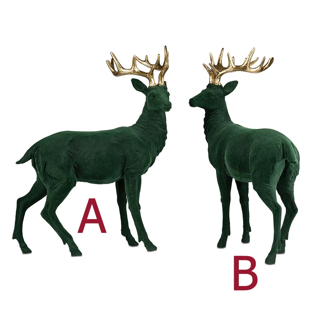 Deko-Hirsch grün stehend 34 x 44 cm oder 34 x 43 cm aus Kunststein mit geflockter Oberfläche und goldenem Geweih veredelt von formano. Die Hirsche oder Geweihträger sind eine Säugetierfamilie aus der Ordnung der Paarhufer. Die Dekofigur setzt in ein weihnachtliches Ambiente stilvolle, erhabene Akzente.