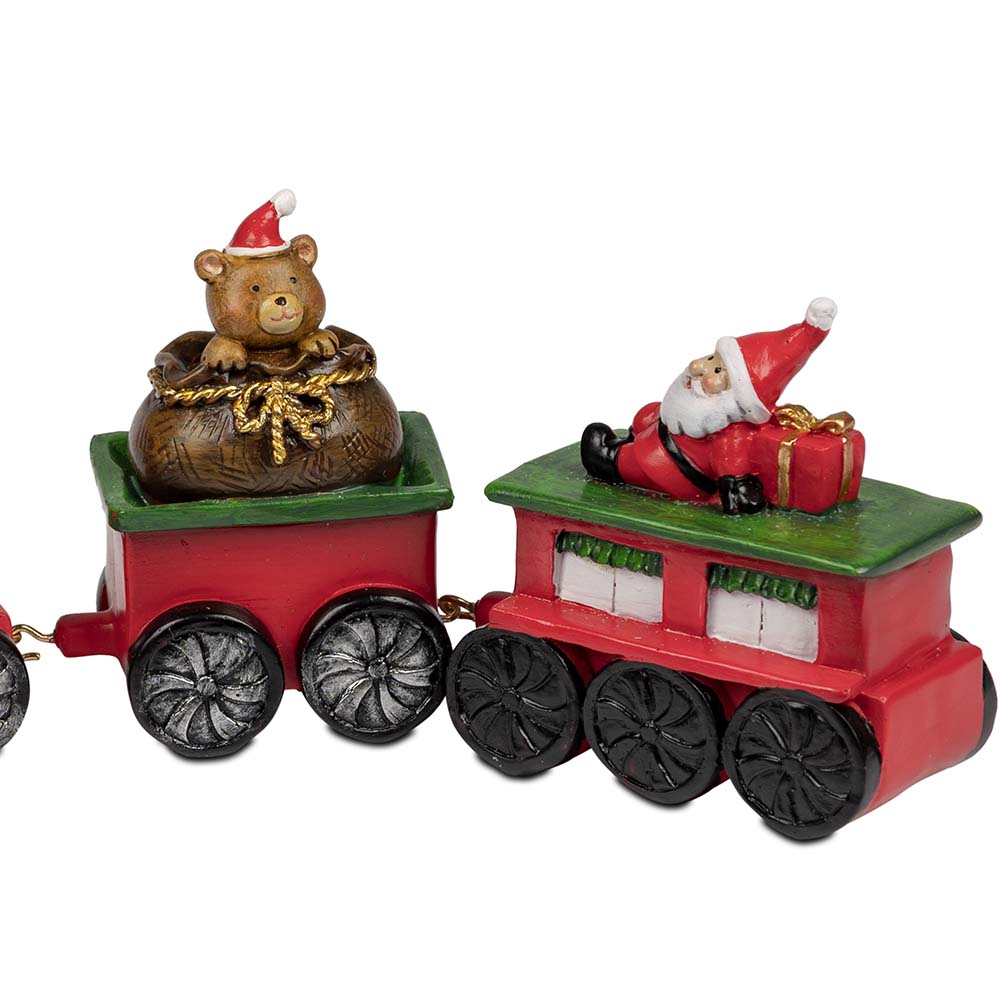Eisenbahn mit Figuren 30 x 8 cm Nostalgie aus Kunststein gefertigt und handbemalt von formano. Der Zug mit tollen Details ( Weihnachtsteddy, Wichtel, Schneemann, Tannenbaum, Geschenke, Teddybär im Sack, Weihnachtsmann mit Weihnachtsgeschenk )eine originelle Dekoidee für Ihre Advents- und Weihnachtsdeko.