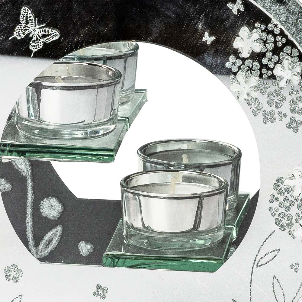 Deko-Licht 2-flammig 18x16,5 cm eine Kombination aus klarem + Spiegel-Glas mit Glitter-Dekor und aufgesetzten Blumen verziert. Der Teelichthalter ist eine romantische Dekoidee für Ihre Dekoration aus dem Hause formano.