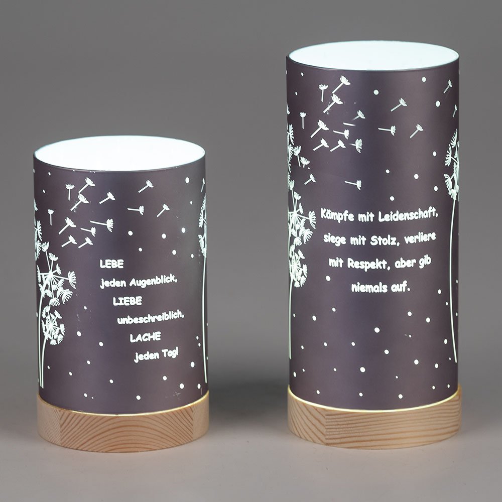 809643 Deko-Licht 15 cm oder 809667 Deko-Licht 20 cm mit Holz-Sockel, aus Glas lila mit LED-Licht, Spruch + Dekor